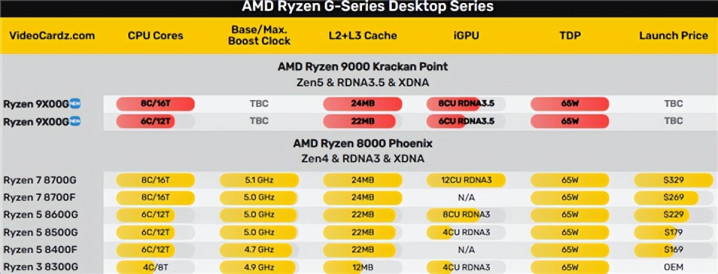在此之前,我们一直以为锐龙9000G系列会基于主流移动版Strix Point,也就是锐龙AI 9 300系列,最多12核心24线程、36MB缓存、5.1GHz加速频率、16个GPU核心,热设计功耗也是最高54W。