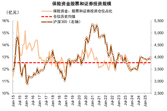 ► 保险资金:入市进程加快。在去年9月《关于推动中长期资金入市的指导意见》[4]政策推动下,我国中长期资金入市进程加快,配置A股积极性提升。《方案》明确力争大型国有保险公司从2025年起每年新增保费的30%用于投资A股。截至2025年2季度末,保险资金运用余额达36.2万亿元,其中,股票和证券投资基金配置规模为4.7万亿元,占可运用余额13%,较去年同期提升1个百分点。我们测算,保险资金持有A股市值占A股自由流通市值比重从2024年的约8.5%提升至2025年6月的约9.2%,在政策推动下,保险资金有望持续逐步提升其投资 A 股的规模与比例。