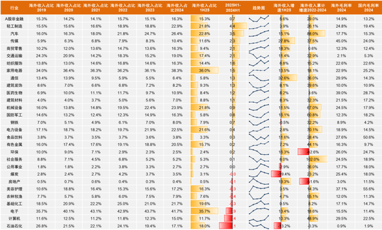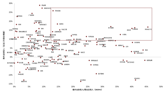 3)出海仍是基本面确定性较高机遇。近年来全球贸易不确定性有所上升,但我国制造业的全球竞争力也同步提升,上市公司的海外产能布局有望抵消部分影响。同时企业通过出口出海获得新的增长驱动力,一定程度上弥补了内需的相对不足。当前A股非金融企业海外业务收入占比或继续提升(2024年16.3% vs. 2021年14.1%)。我们基于海外收入占比、海外与国内业务收入对比、以及海外毛利率等维度进行筛选,并综合考虑行业海外业务对美依赖度,白色家电、工程机械、商用车、游戏及电网设备等出口出海行业具备较好的业绩确定性。