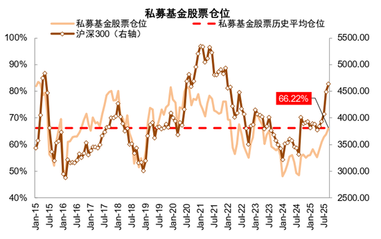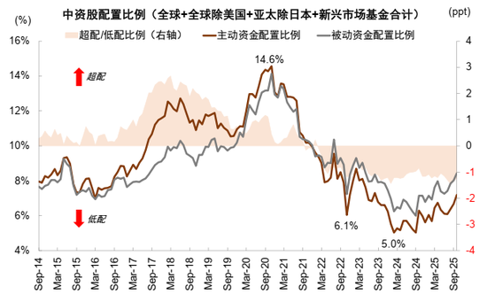 ► 公募基金:A股仓位仍有提升空间。今年年初,中央金融办等6部门联合印发《关于推动中长期资金入市工作的实施方案》[3](以下简称《方案》),《方案》明确了公募基金持有A股流通市值未来三年每年至少增长10%。在公募基金改革大力推动下,3季度末,公募基金股票资产规模扩张至9万亿元,其中持有A股市值占比19.35%,较2024年底提升2.4个百分点。结构层面,主动型基金仍面临一定的赎回压力,被动基金规模及占比不断提升,我们预计随着市场赚钱效应的改善,主动基金发行也有望进一步好转。